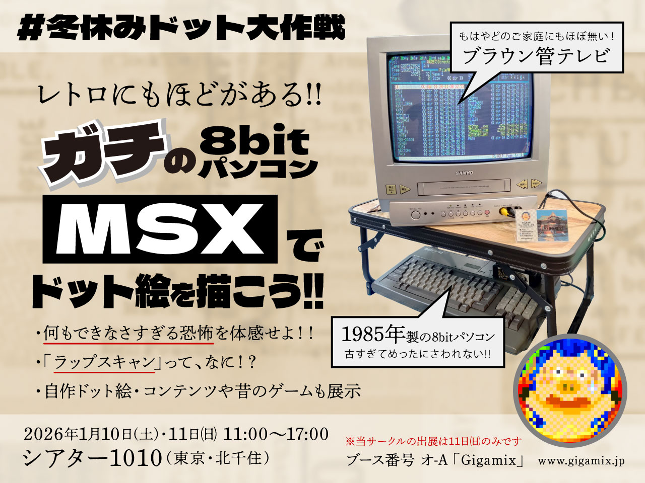 当クラブ(Gigamix)主宰のニューファンキー小林(Xアカウント:@nf_ban)がピクセルアートイベント「冬休みドット大作戦」へサークル出展いたします。これまでMSXとかレトロPCのカテゴリでは何度かサークル出展した経験はありますが、私(nf_ban)にとって未知のカテゴリ…ピクセルアートのイベントへ初出展します。
